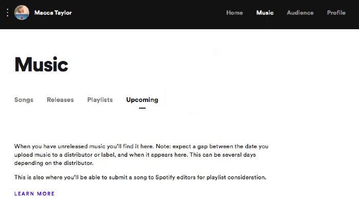 Hesabınıza girdikten sonra Music sekmesi altında Upcoming linkine tıklayarak talep sürecine başlayabilirsiniz.