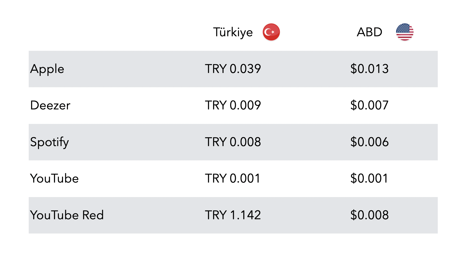 Bu durumda ABD için toplanan gelir USD cinsinden olduğu için izlenme/dinlenme başına elde edilen gelir Türkye için elde edilen gelirden yüksek oluyor. Bunu tek sebebi TRY/USD arasındaki kur farkı ve ülke başına elde edilen gelirlerin lokal para biriminde olması.